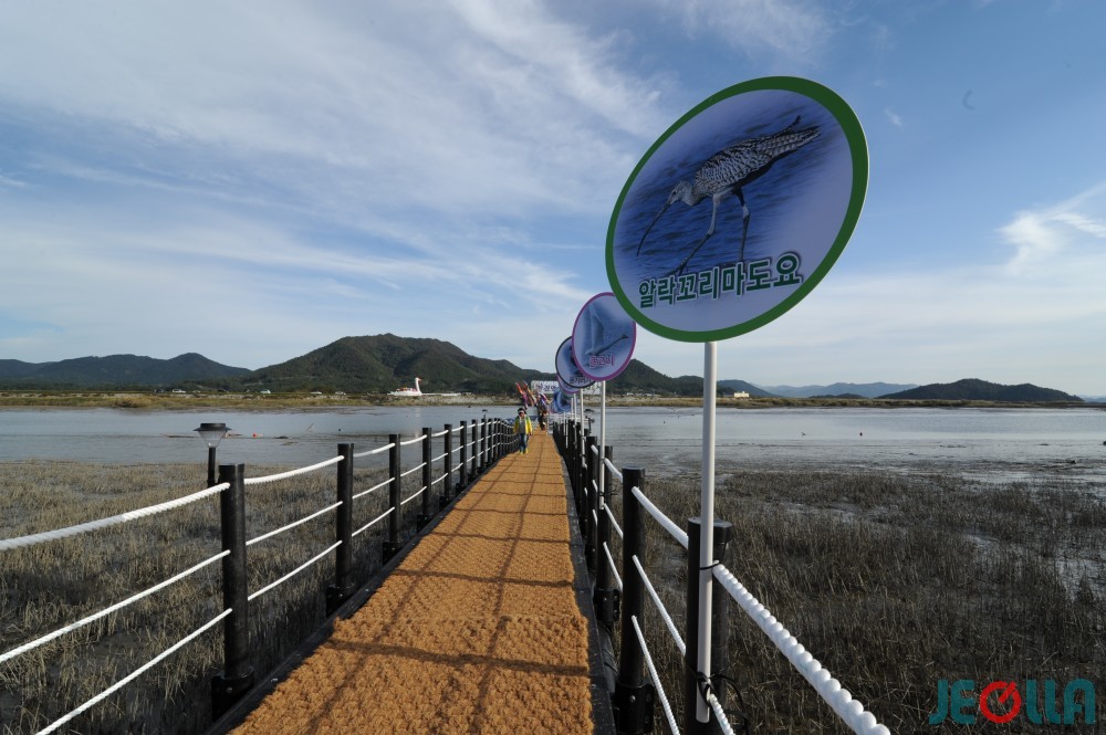 고니상이 서있는 곳으로 건널 수 있는 부잔교. 강진만 갈대숲을 건너지르고 있다.