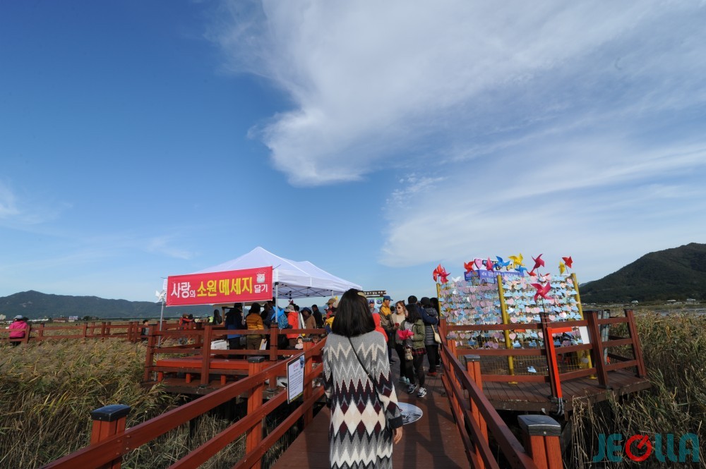 필자와 일행은 축제장을 찾은 인파가 별로 찾지 않은 목리교까지 가서 다리를 건넌 다음, 강 반대편 탐방로와 강둑, 그리고 부잔교를 거쳐 다시 돌아오는 코스를 걷고 또 걸었다. 주무대를 벗어난 탐방로에는 인적이 드물었지만 그래도 군데군데서 탐방객의 모습을 발견할 수 있었다. 밀회를 즐기는 청춘 남녀의 모습도 눈에 띄었고, 쓸쓸한 뒷모습으로 아이들과 함께 벤치에 안아있는 여성의 모습도 발견할 수 있었다.