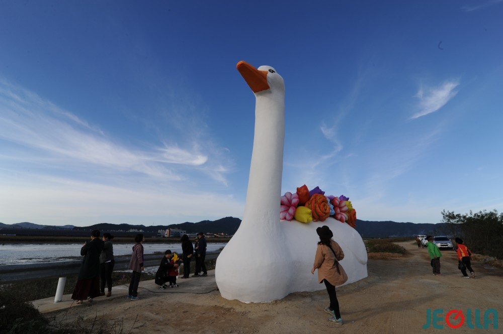 ‘제1회 춤추는 강진만 갈대축제’가 열리던 10월 30일은 높고 파란 하늘에 스프레이를 뿌려놓은 듯한 하얀 구름이 가을 나그네의 마음을 미치도록 흔드는 날이었다. 주무대에서는 통기타 선율에 맞춰 귀에 익은 포크송이 연신 연주되고, 황하코스모스가 피어있는 넓은 밭자락에서는 한 소녀가 셀피에 열중이었다. 몇몇 사람들은 범선 위에 올라 강진만 갈대숲을 바라보거나 폰카에 자신의 얼굴과 갈대숲 장면을 담기에 바빴다. 갈대숲 탐색을 마친 이들은 갈대숲을 연결한 탐방로는 따라 갈대숲을 향해 나아갔고, 탐진강을 건너지르는 부잔교를 건너 고니상이 서있는 강둑에서 기념사진을 촬영하기도 했다. 이날 갈대축제를 찾은 이들의 대부분은 이 코스를 왕복하는 것에 그쳤다.