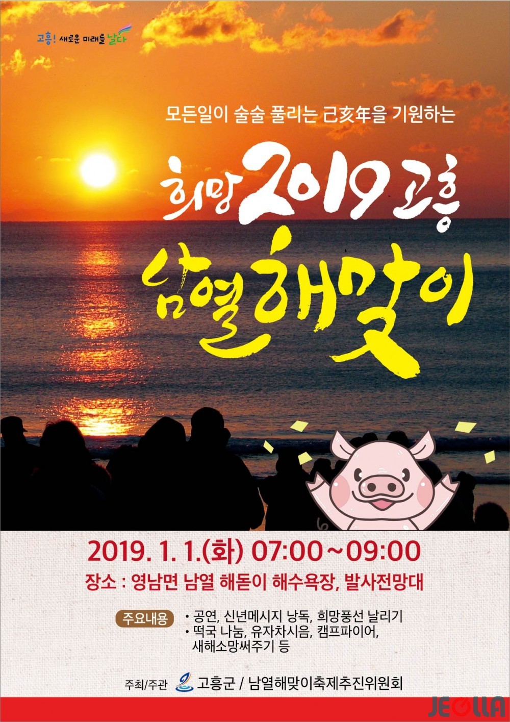 고흥군(군수 송귀근)은 오는 1월 1일(화) 영남면 남열 해돋이 해수욕장에서 관광객과 군민이 새 출발?새 각오를 다짐하고, 소망과 행복을 기원하는 ′2019 새해 고흥 남열 해맞이 행사′를 개최한다고 밝혔다.