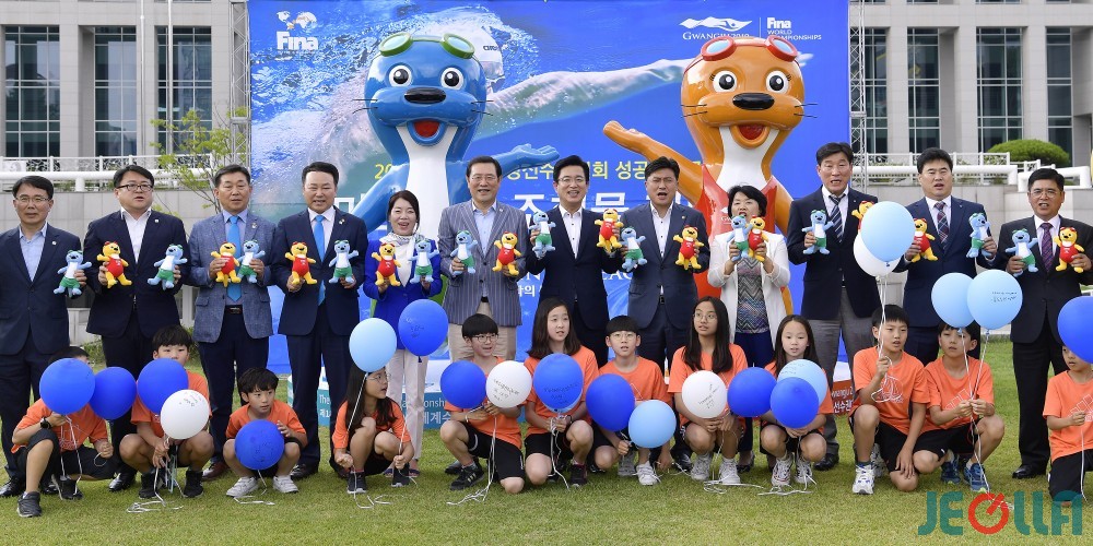 • 이용섭 광주광역시장(대회조직위원장)이 24일 오후 대전시청 잔디에서 열린 2019 광주세계수영선수권대회 D-20 기념 마스코트 수리·달이 조형물 제막식에 참석해 허태정 대전시장, 김종천 대전시의회 의장, 임미란 광주시의회 부의장, 대전흥도초등학교 수영부 등 내빈들과 대회 성공개최를 기원하며 구호를 외치고 있다./광주광역시 제공