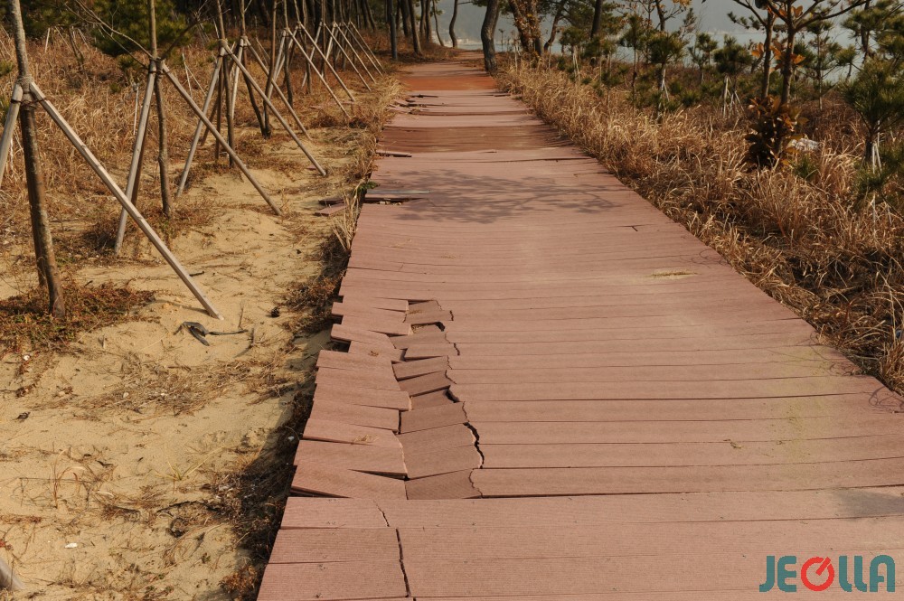 완도군이 블루플래그 재인증 추진하고 있는 명사십리해수욕장의 관리 실태가 엉망이다. 해수욕장 송림을 따라 관광객들이 걸어 다닐 수 있게 조성된 데크가 부서지거나 움푹 패여 관광객들의 안전을 위협하고 있다.