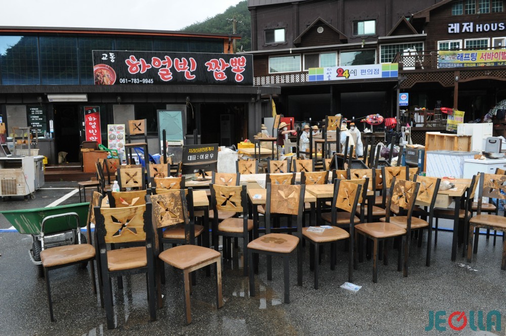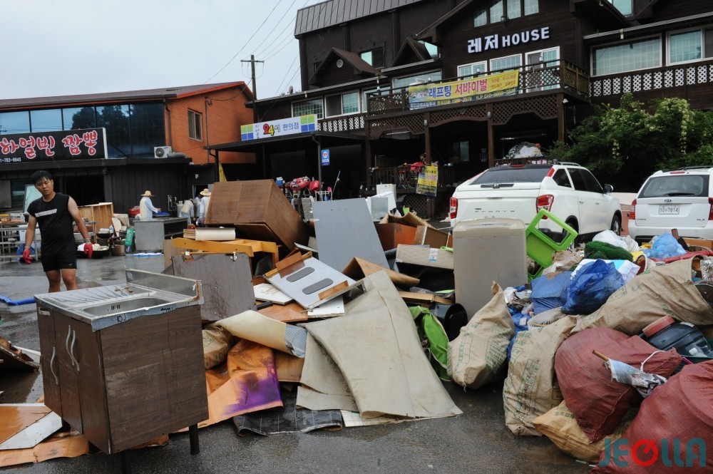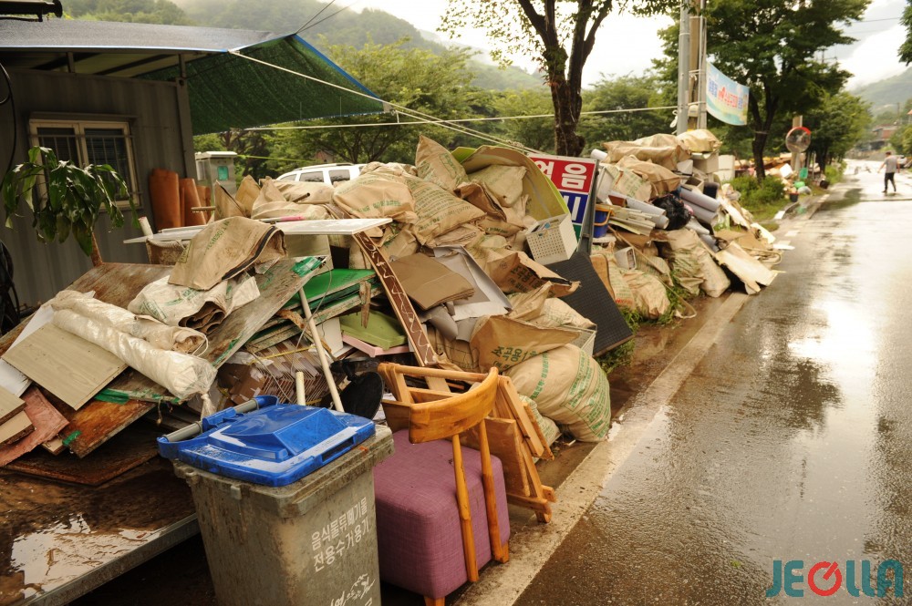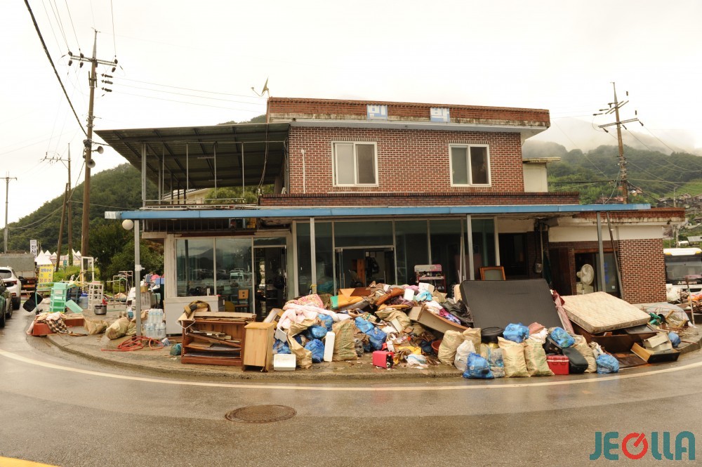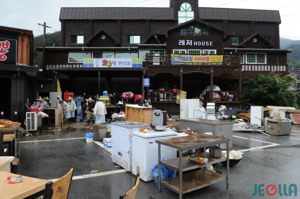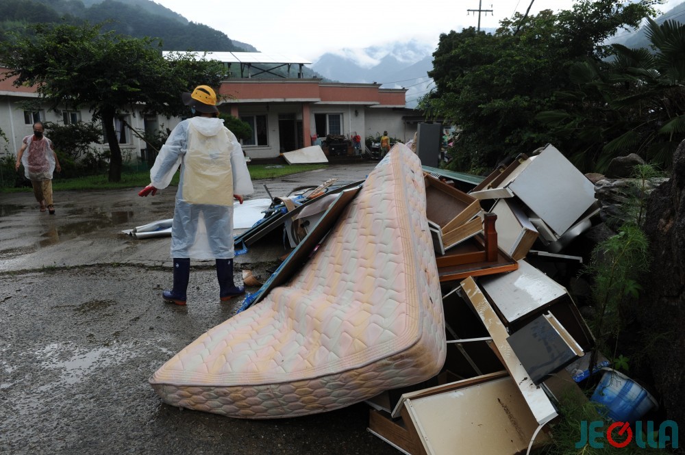 • 11일, 섬진강 범람으로 물벼락을 맞은 구례군 토지면 외곡리 수해 현장은 물 빠진 수중 마을의 모습이었다. 집 안에서 자원봉사자들의 손에 들려 나오는 가재도구나 가전제품 중 재사용이 가능한 제품은 거의 없어 보였다.