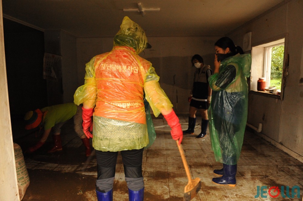 전라남도교육청 직원들과 순천시자원봉사자센터 회원 등이 부지런히 정리를 해보지만 오락가락 하는 비에 작업은 힘들고 더디기만 했다.