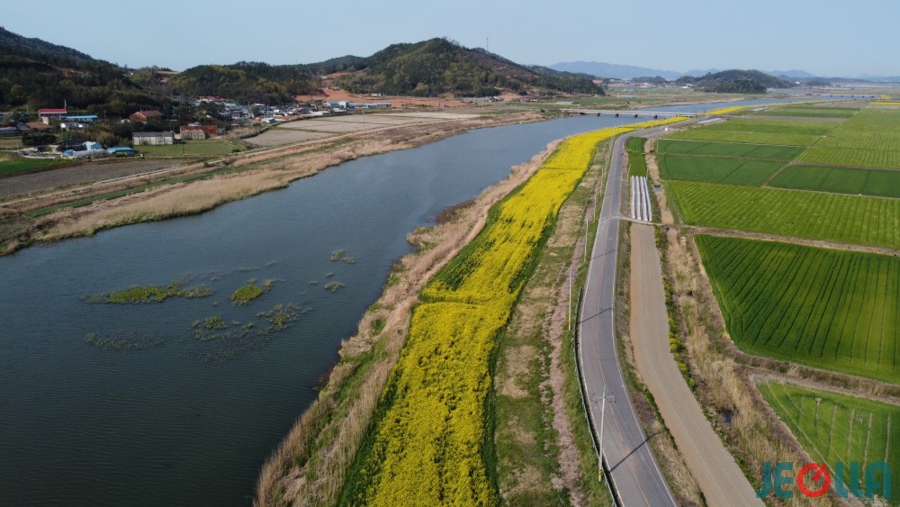삼산천 둔치에도, 고천암 농경지에도 온통 유채꽃이다. 유채 꽃밭은 삼산천 둔치를 따라 10여 리 넘게 길게 이어지고 있으며, 간척지에는 바둑판처럼 네모난 유채 꽃밭이 유채꽃 평야를 이루고 있다.