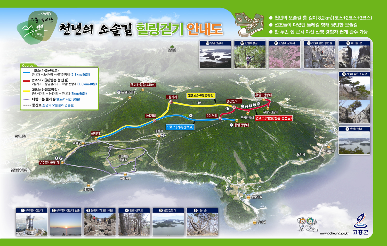 고흥군(군수 박병종)은 영남면 남열리에 위치한 우주발사전망대와 주변의 아름다운 미르 마루길과 우미산 오솔길을 연계한 “휴일아침 힐링캠프”를 오는 6월까지 운영한다고 밝혔다. 휴일아침 힐링캠프는 우주발사전망대 일출 관람, 우미산 천년의 오솔길 걷기, 유채꽃 만발한 다랑이논길 걷기 코스를 연계하여 구성한 국민 건강 걷기 체험 프로그램으로..